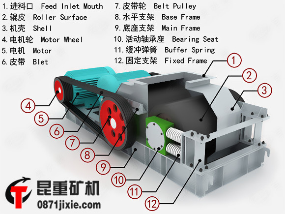 對(duì)輥式破碎機(jī)工作時(shí),破碎物料經(jīng)給料口落入兩輥?zhàn)又g,進(jìn)行擠壓破碎,成品物料自然落下。若遇過硬或不可破碎物時(shí),對(duì)輥式破碎機(jī)的輥?zhàn)涌蓱{液壓缸或彈簧的作用自動(dòng)退讓,使輥?zhàn)娱g隙增大,過硬或不可破碎物落下,從而保護(hù)機(jī)器不受損壞。相向轉(zhuǎn)動(dòng)的兩輥?zhàn)佑幸欢ǖ拈g隙,改變間隙,即可控制產(chǎn)品最大排料粒度。雙輥破碎機(jī)是利用一對(duì)相向轉(zhuǎn)動(dòng)的圓輥,四輥破碎機(jī)則是利用兩對(duì)相向轉(zhuǎn)動(dòng)的圓輥進(jìn)行破碎作業(yè)。